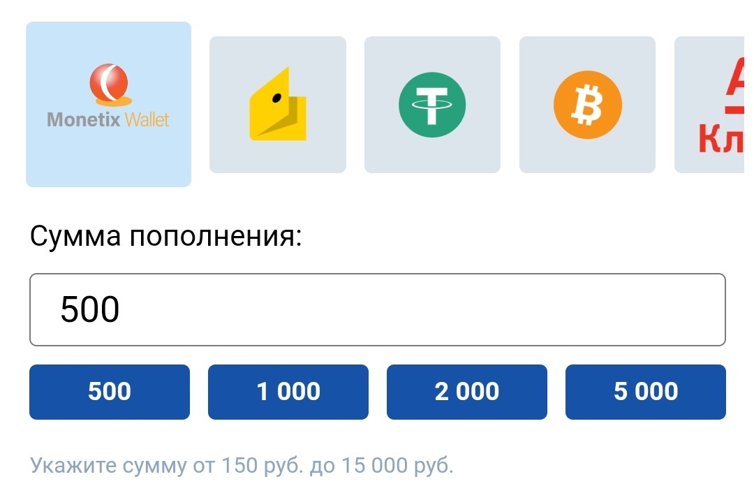 - 6. Для депозита на сайте, необходимо выбрать в Кассе способ пополнения через Monetix Wallet. Выбрать необходимую сумму депозита и нажать "Продолжить".